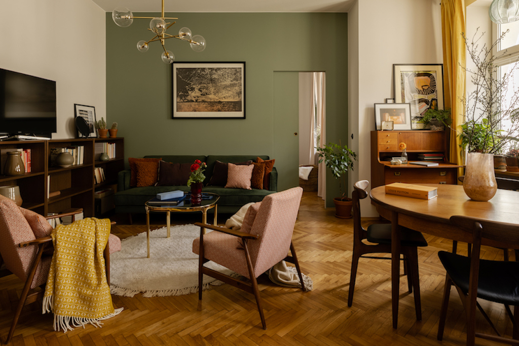 This is a spacious bright room with a spacious library housing the entire collection of books. The style that dominates is definitely timeless vintage. Also worth noting is the keeping of the original floorboard laid in a herringbone pattern. Furniture dating back to the prl era was used in this room. Most of them are recycled pearls - old chairs as well as armchairs, thanks to new upholstery created by a local craftsman, have taken on new life and brought soul to the room. Combined with a sofa in a shade of deep green and accessories in bold colors, the whole thing corresponds perfectly with each other and amazingly reflects the style of the 50,60's. In this living room definitely everyone can feel at home. There is an aura of uniqueness and perfectly fine details such as a modern lamp, or art in the form of posters by local artists. You can soak in this interior while sipping hot tea with honey and cinnamon.