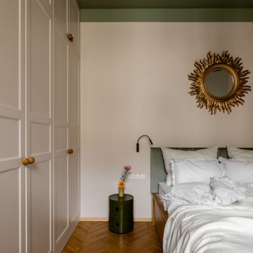 This is an oasis of peace. The place where the bed appears in the leading role and it is around it that all attention is focused. A large wooden one with a headrest in warm green, harmonizing with the shade of the walls in the upper part of the room. The designer's suggestion to paint the ceiling with a pull on a piece of the wall made the room feel cozy. Thanks to the unique accessories, such as the characteristic gold mirror and, as in the living room, original posters, the room is a coherent whole.