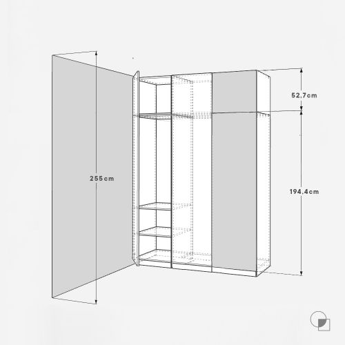 Example A: standard height door for PAX wardrobe and separate door for the extension. The standard size of the PAX wardrobe door with a height of 201 cm is 194.4 cm, for a 53 cm high extension, we choose a door 3 mm smaller than this dimension, i.e. 52.7 cm high.