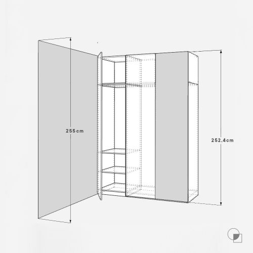 In this variant, we will use an example where the height of the room is 255 cm. After reading our guide on how to choose the height of the extension for your PAX wardrobe, you already know that your extension will be 53 cm high. The height of 201 cm PAX wardrobe with the QOOD extension is 254 cm. The figure shows examples of door layouts along with their sizes.