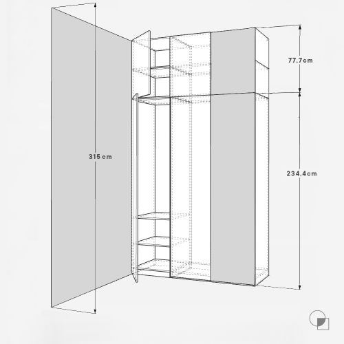 In this variant, we will use an example where the height of the room is 315 cm. After reading our guide on how to choose the height of the extension for your PAX wardrobe, you already know that they will be 40 cm and 38 cm high. The height of the PAX wardrobe is 236 cm with the QOOD extensions 314 cm. The figure shows examples of door layouts along with their sizes.