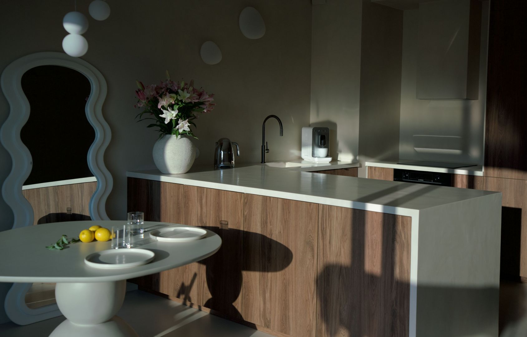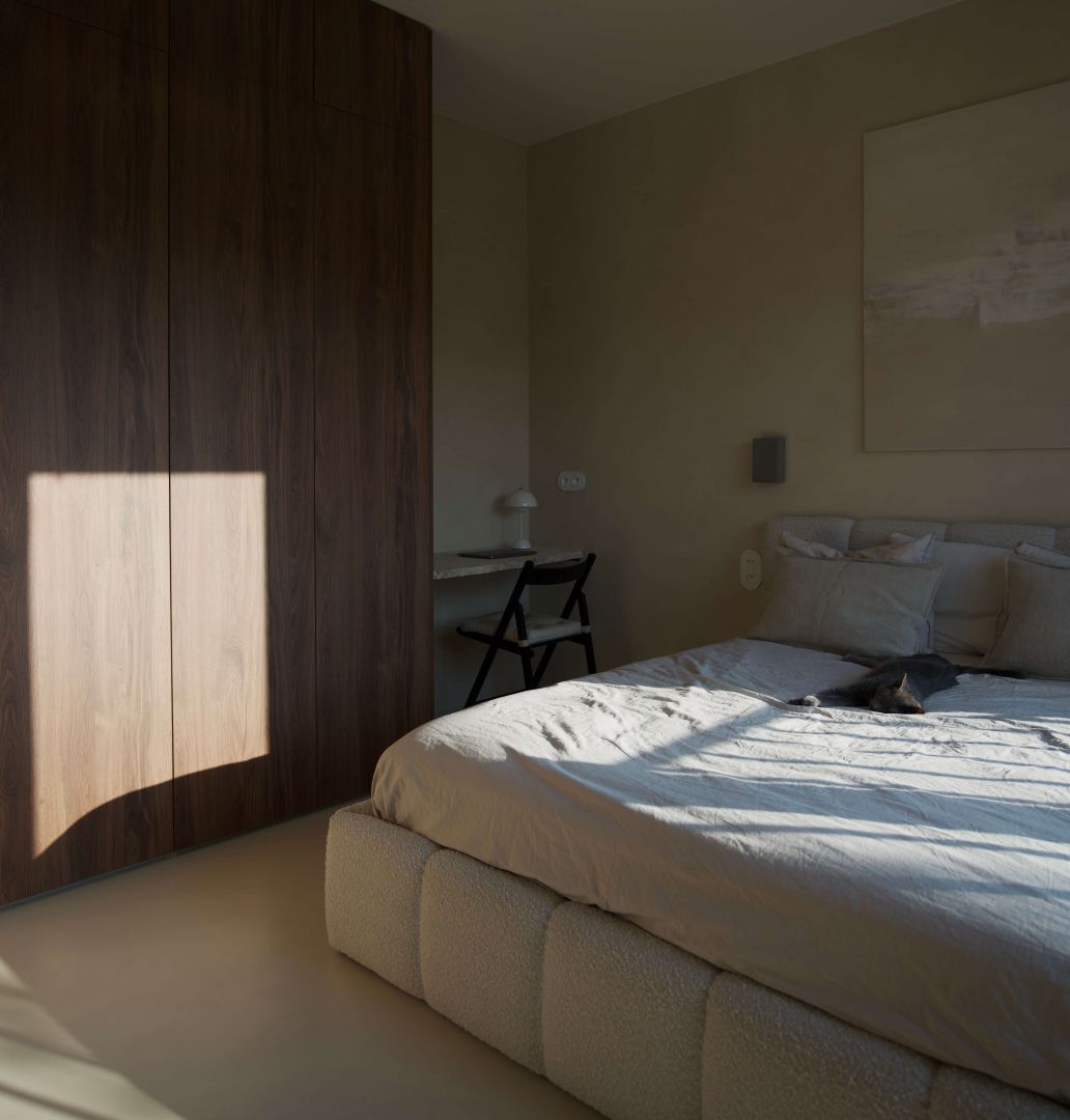 Ciemnobrązowy odcień drewna wprowadza do wnętrza ciepło i naturalność, a faktura powierzchni dodaje głębi. Blat kuchenny, wykonany z płyty MDF pokrytej mikrocementem, wpisuje się w minimalistyczną estetykę, oferując jednocześnie nowoczesny wygląd, który doskonale koresponduje z pozostałymi elementami. Ściany i podłoga również zostały pokryte mikrocementem, co dodatkowo podkreśla spójność przestrzeni.