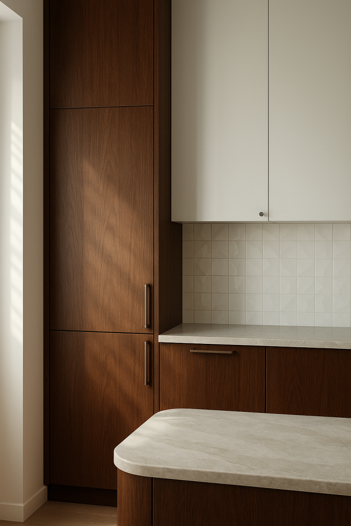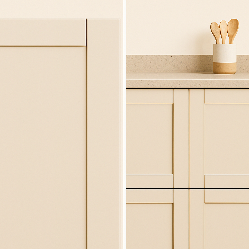 Fronty kuchenne mają dużą moc w zmienianiu wyglądu kuchni. Jak optycznie powiększyć małą kuchnię? Postaw na jasne kolory! Biel, kremy czy szarości z palety NCS / RAL odbijają światło, co wpływa na poczucie przestronności. Matowe wykończenia, jak ultramat z kolekcji Velvet od Forner, sprawiają, że powierzchnia jest jednolita i nie odbija światła, co redukuje efekt „cięcia” przestrzeni. Ciekawym trikiem jest też sięgnięcie frontami aż do sufitu — likwiduje to pustą przestrzeń nad szafkami i tworzy spójną, ciągłą linię. Fronty fornirowane w jasnym dębie lub z delikatną bejcą dodają głębi i naturalnego ciepła. Matowy lakier sprawia, że całość wygląda lekko, a jasność nie znika. W QOOD można dobrać fronty do mebli w dowolnym kolorze z palet RAL i NCS, więc łatwo dopasować je do koncepcji powiększenia kuchni.