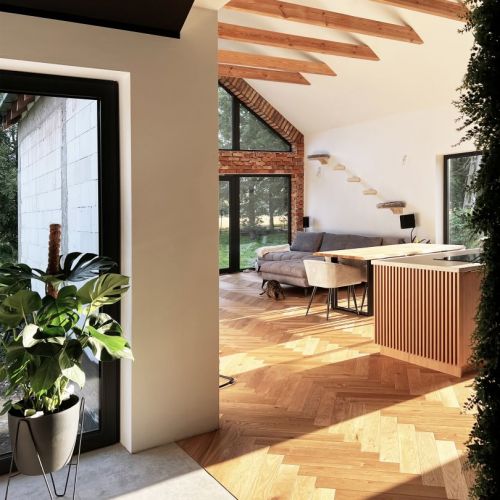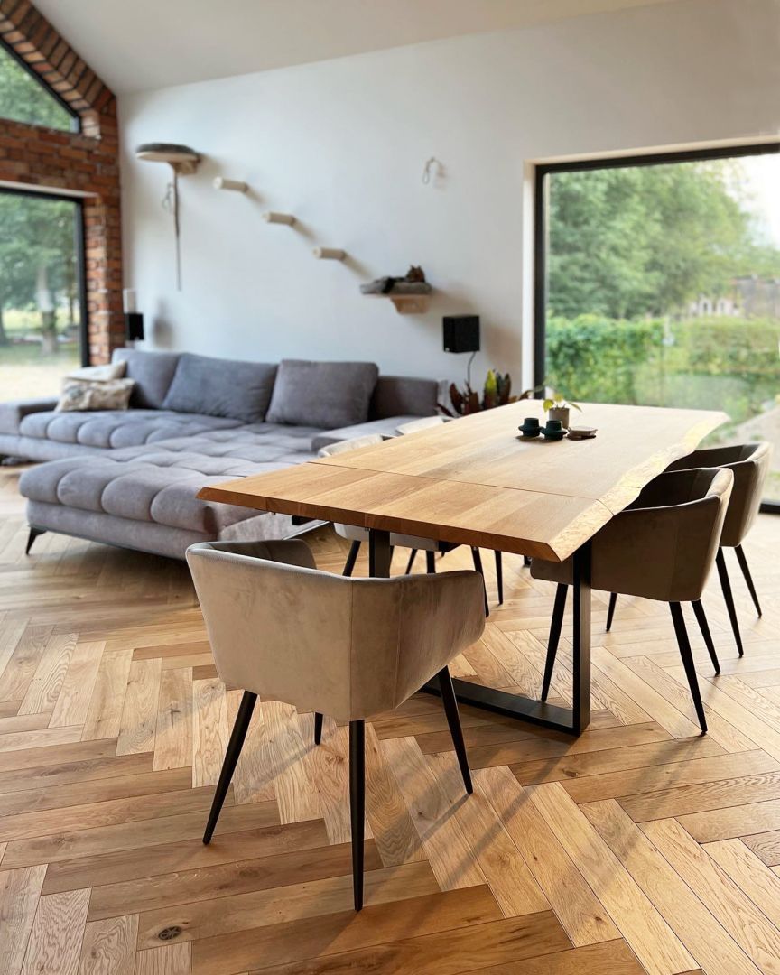 Jesteśmy bardzo zadowoleni z deski i ostatecznie bardzo cieszymy się, że opcje którą na początku odrzuciliśmy przez cenę, ostatecznie mamy u siebie. Prawdę mówiąc, cały dom przygotowywaliśmy pod płytki i panele - wylewki były dostosowane do ich wysokości. Zależało nam na braku progów w domu, więc np. winyle nie wchodziły w grę. Początkowo byliśmy przekonani, że położymy płytki w typie chevron, jednak ceny w naszym rejonie za robociznę tak podskoczyły do góry, że w tej samej cenie mamy prawdziwą deskę. Wybór był prosty i dla nas oczywisty. Po drodze był pomysł na panele w jodełkę, jednak szybko z nich zrezygnowaliśmy ze względu na długi czas oczekiwania, a chcieliśmy budować się szybko. Deskę mamy z outletu i była to najlepsza decyzja - dostępna od ręki oraz piękna, naturalna, ciepła