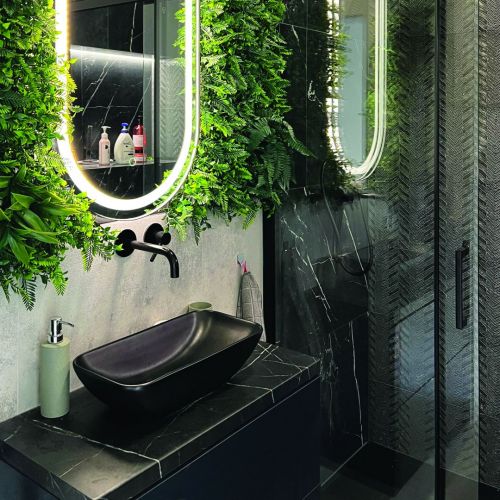 Tak naprawdę za całe wnętrze odpowiadała Ewelina. Patryk tylko mówił co mu się podoba i jak wyświetliło mu się jakieś wnętrze, to podsyłał Ewelinie. Od samego początku mieliśmy ustalone, że kuchnia będzie po sam sufit czarna. Ewelina zaprojektowała całą kuchnię w Homestyler i pokazywała mi co jakiś czas, aż doszliśmy do wersji ostatecznej. Niemniej, to była bardziej kosmetyka, typu dołożenie zieleni na ścianie i lamele na wyspie. Ewelina projektowała kuchnie około miesiąca, skończyła kurs projektowania wnętrz, więc posiada podstawową wiedzę. Inspiracji szukała na pinterest, instagramie głównie zagranicznym i grupach dla architektów na Facebook.