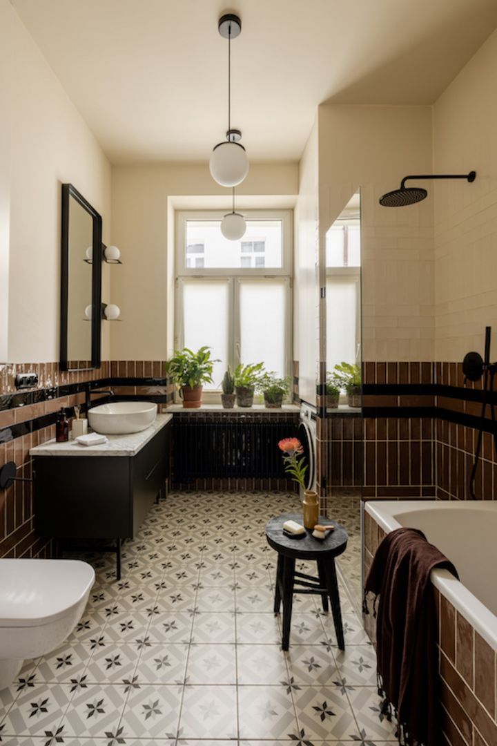 To całkowicie nowe pomieszczenie, które pojawiło się w mieszkaniu w zupełnie innej odsłonie. Jasna, przestronna łazienka z dużym oknem, zdecydowanie odmieniła jakość życia. Na ścianach i wannie pojawiły się ciemne płytki w stylu retro, a na podłodze oryginalna mozaika idealnie współgrająca z całością. Meble i dodatki to elegancka prostota, szafka pozwalająca schować niezbędne bibeloty, klasyczne lustro w czarnej ramie, oraz mleczne okrągłe lampy.