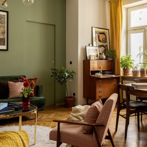 To przestronne jasne pomieszczenie z obszerna biblioteką mieszczącą całą kolekcję książek. Styl jaki przeważa to zdecydowanie ponadczasowy vintage. Warte podkreślenia jest również zachowanie oryginalnej deski podłogowej ułożonej w jodełkę. W tym pomieszczeniu zostały wykorzystane meble rodem z prl-u. Większość z nich to perełki z odzysku – stare krzesła jak i fotele dzięki nowej tapicerce stworzonej przez lokalnego rzemieślnika, nabrały nowego życia i wprowadziły do pomieszczenia duszę. W połączeniu z kanapą w odcieniu głębokiej zieleni i dodatkami w wyrazistych kolorach, całość idealnie ze sobą koresponduje i niesamowicie oddaje styl lat 50,60. W tym salonie zdecydowanie każdy może poczuć się jak w domu. Panuje w nim aura wyjątkowości i doskonale dopracowanych detali takich jak nowoczesna lampa, czy sztuka w postaci plakatów lokalnych artystów. Można zanurzyć się w tym wnętrzu popijając gorącą herbatę z miodem i cynamonem.