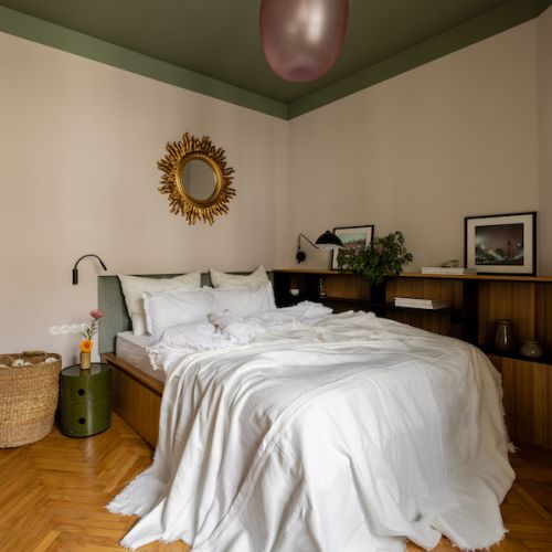 To oaza spokoju. Miejsce, gdzie w roli głównej pojawia się łóżko i to wokół niego skupia się cała uwaga. Tutaj duże drewniane z zagłówkiem w kolorze ciepłej zieleni, współgrającym z odcieniem ścian w górnej części pomieszczenia. Zaproponowany przez projektantkę zabieg pomalowania sufitu z przeciągnięciem na kawałek ściany spowodował, że pomieszczenie nabiera przytulności. Dzięki wyjątkowym dodatkom, jakimi jest charakterystyczne złote lustro i podobnie jak w salonie oryginalne plakaty, pokój jest spójną całością.