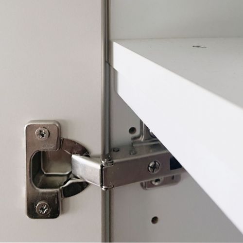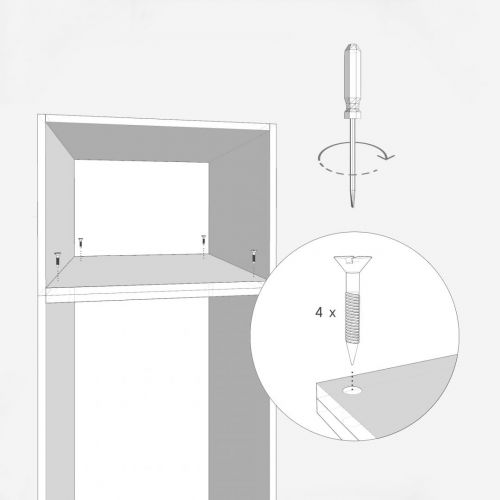 Za pomocą wkrętów skręć dolną część nadstawki QOOD z górną częścią szafy PAX. Najlepiej zastosuj po jednym wkręcie w każdym narożniku. W przypadku większego rozmiaru szafy, na przykład o szerokości 100 cm, zastosuj dodatkowe wkręty w połowie szerokości przedniej krawędzi.